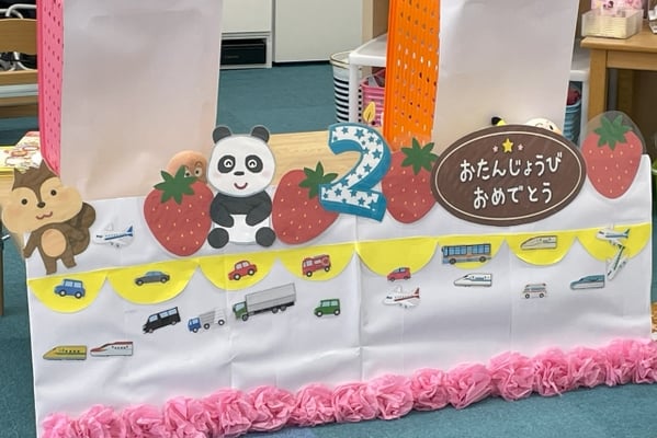 先生が用意してくれたケーキに、お友達が車や電車など、乗り物でデコレーションをしてくれます。