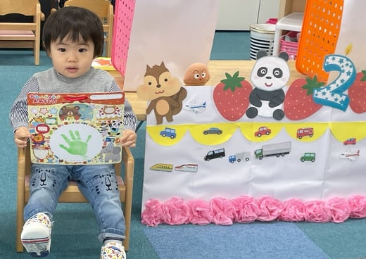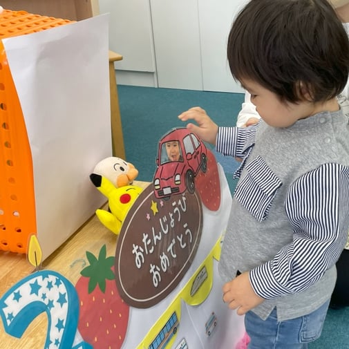 お友達にお誕生日のカードをもらって、大好きな乗り物にも囲まれて、幸せそうなお友達。