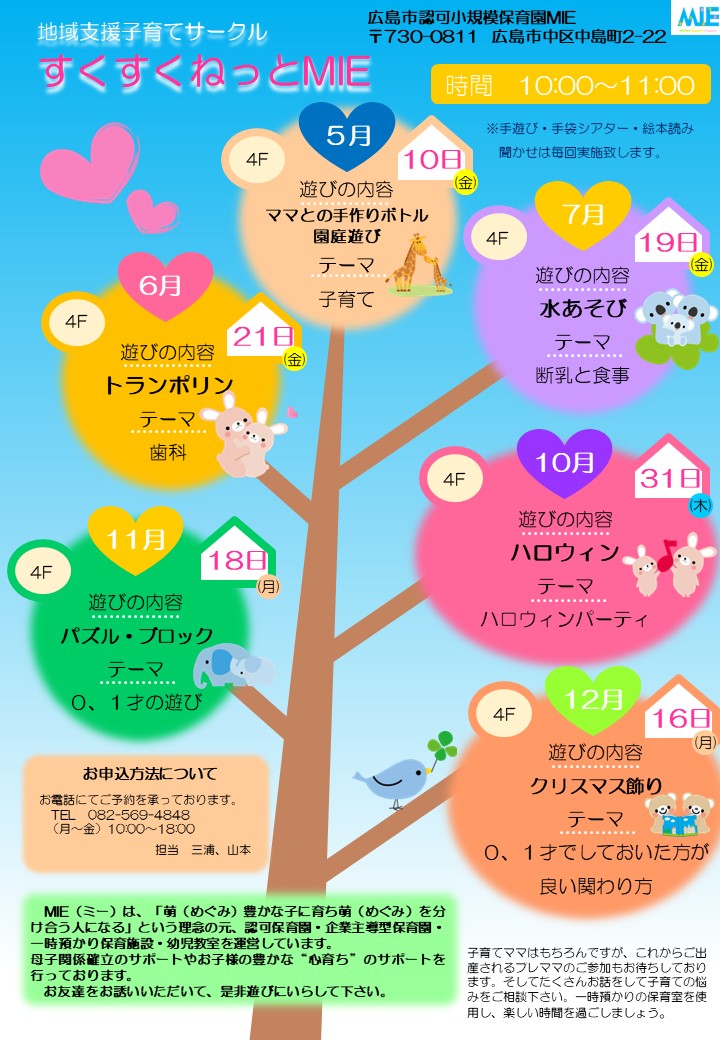 Blog · 2024/05/09 子育て支援 すくすくねっとMIE 子育て支援 すくすくねっとMIE のご案内です。 昨年度大変好評だった、子育て支援 すくすくねっとMIEを、今年度も開催いたします✨ MIEでは地域支援子育てサークルとして、プレママの方や、お母さまとお子さまがご一緒に無料で遊んでいただける場を提供しています。 明日5月10日(金)の回には、8組のご予約をいただいております。 6月以降のご予約にはまだ空きがあります。 082-569-4848 ご希望の方はお電話にてご予約ください。 tagPlaceholderカテゴリ: