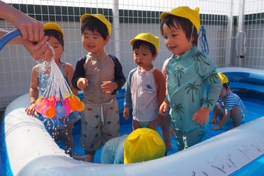 毎日温度・湿度を測り熱中症アラートがでている日は9階の屋根がある涼しい場所でプール遊びを楽しんでいます!