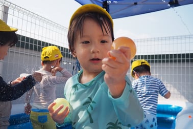 「見て見て~気持ちいよ~」とお気に入りの色の水風船を大事そうに持って遊んでいました😊